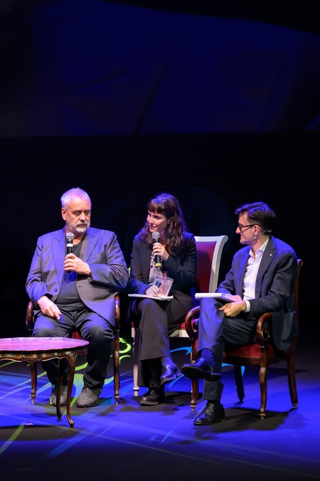 Lucca Comics & Games 2025 inauguration with institutions, artists, and a large audience. On stage, Rébecca Dautremer, author of the Lucca Comics & Games 2025 poster, along with presenter Marta Perego and director Luc Besson, a master of European and international cinema on Spet 29th 2025, Credit:Stefano Dalle Luche / Avalon