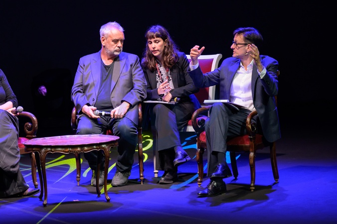 Lucca Comics & Games 2025 inauguration with institutions, artists, and a large audience. On stage, Rébecca Dautremer, author of the Lucca Comics & Games 2025 poster, along with presenter Marta Perego and director Luc Besson, a master of European and international cinema on Spet 29th 2025, Credit:Stefano Dalle Luche / Avalon