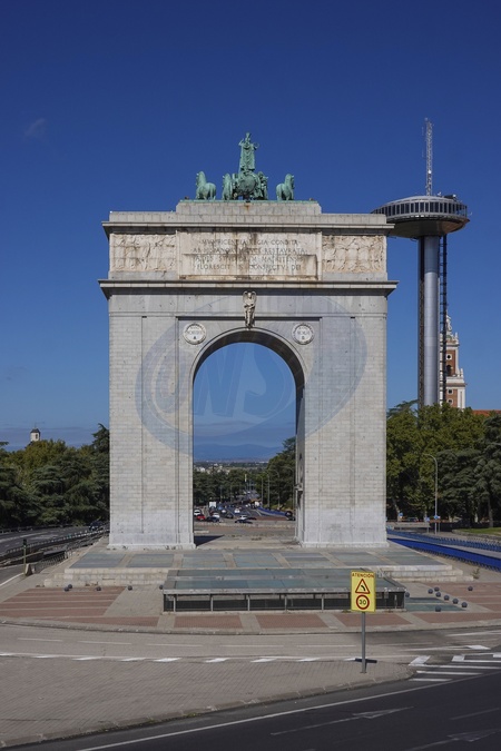 Spain, Madrid, Arco de la Victoria aka Puerta de la Moncloa is a triumphal arch built in the Moncloa district of Madrid, The arch was constructed at the behest of Francisco Franco to commemorate the victory of Francoist troops in the 1936 Battle of Ciudad Universitaria, part of the Spanish Civil War., Credit:Fabio Mazzarella / Avalon