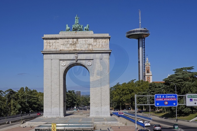 Spain, Madrid, Arco de la Victoria aka Puerta de la Moncloa is a triumphal arch built in the Moncloa district of Madrid, The arch was constructed at the behest of Francisco Franco to commemorate the victory of Francoist troops in the 1936 Battle of Ciudad Universitaria, part of the Spanish Civil War., Credit:Fabio Mazzarella / Avalon
