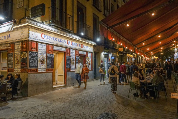 Spain, Madrid, People eating and drinking al fresco in central Madrid, Credit:Fabio Mazzarella / Avalon