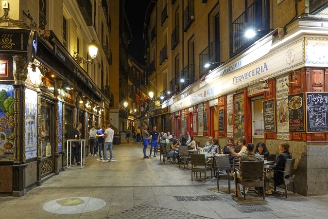 Spain, Madrid, People eating and drinking al fresco in central Madrid, Credit:Fabio Mazzarella / Avalon