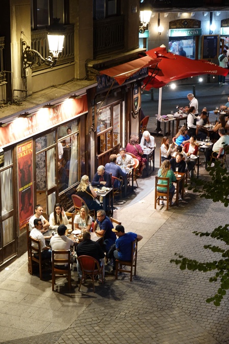 Spain, Madrid, People eating and drinking al fresco , La Casa del Abuelo, traditional restaurant and Tapas bar, Huertas, Credit:Fabio Mazzarella / Avalon