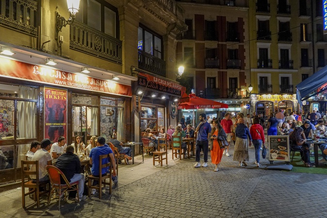 Spain, Madrid, People eating and drinking al fresco , La Casa del Abuelo, traditional restaurant and Tapas bar, Huertas, Credit:Fabio Mazzarella / Avalon