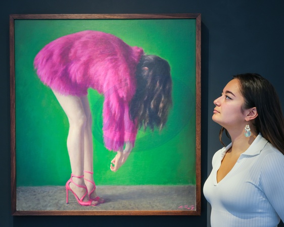 London, UK. 05th Nov, 2025. Staff with 'Ostrich', 2025. Alex Russell Flint, painter of 'transgressive glamour', returns for his first solo exhibition in the UK for eight years. The exhibition runs Nov 6-27 at Catto Gallery in Hampstead., Credit:Imageplotter / Avalon