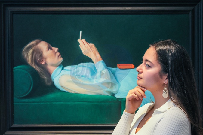London, UK. 05th Nov, 2025. Staff with 'The Shock', 2025. Alex Russell Flint, painter of 'transgressive glamour', returns for his first solo exhibition in the UK for eight years. The exhibition runs Nov 6-27 at Catto Gallery in Hampstead., Credit:Imageplotter / Avalon