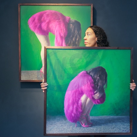 London, UK. 05th Nov, 2025. Staff with 'Ostrich', and 'Cocoon', both 2025. Alex Russell Flint, painter of 'transgressive glamour', returns for his first solo exhibition in the UK for eight years. The exhibition runs Nov 6-27 at Catto Gallery in Hampstead., Credit:Imageplotter / Avalon