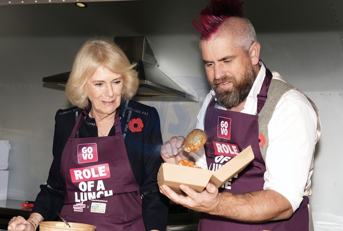 Queen Camilla helps Spudman prepare food as he delivers jacket potatoes in a Royal Voluntary Service food truck, as she hosts members of the National Association of Care Catering (NACC), and representatives from Royal Voluntary Service (RVS) in a celebration of community volunteering during Meals on Wheels Week, at Clarence House in central London. Picture date: Wednesday November 5, 2025., Credit:Jordan Pettitt / Avalon