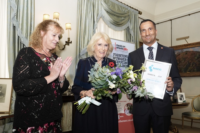 Queen Camilla (centre) is made an honorary member of the National Association of Care Catering (NACC), at an event to celebrate community volunteering during Meals on Wheels Week, at Clarence House in central London. Picture date: Wednesday November 5, 2025., Credit:Jordan Pettitt / Avalon