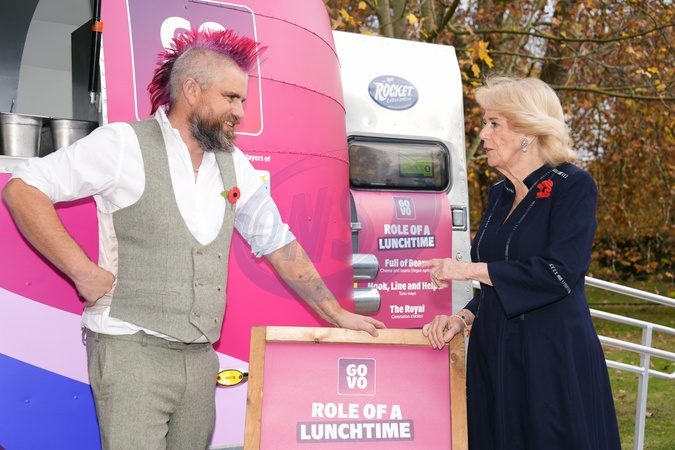 Queen Camilla meets Spudman as he delivers jacket potatoes in a Royal Voluntary Service food truck, as she hosts members of the National Association of Care Catering (NACC), and representatives from Royal Voluntary Service (RVS) in a celebration of community volunteering during Meals on Wheels Week, at Clarence House in central London. Picture date: Wednesday November 5, 2025., Credit:Jordan Pettitt / Avalon