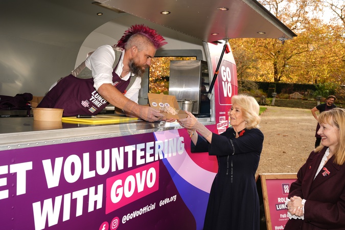 Queen Camilla meets Spudman as he delivers jacket potatoes in a Royal Voluntary Service food truck, as she hosts members of the National Association of Care Catering (NACC), and representatives from Royal Voluntary Service (RVS) in a celebration of community volunteering during Meals on Wheels Week, at Clarence House in central London. Picture date: Wednesday November 5, 2025., Credit:Jordan Pettitt / Avalon
