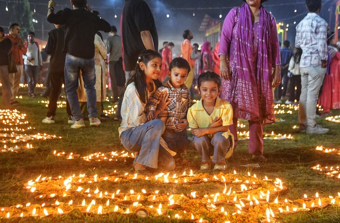 children participate in dev deepawali celebrations by lighting rows of earthen lamps at mankameswar ghat in lucknow, november 5,2025, Credit:Amit Shukla / Avalon