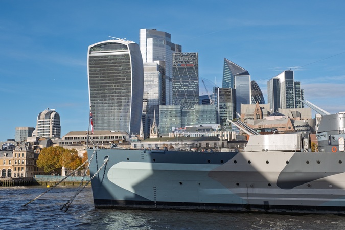 HMS Belfast with the City of London behind.London . United Kingdom. 04 November 2025, Credit:Mark Fairhurst / Avalon