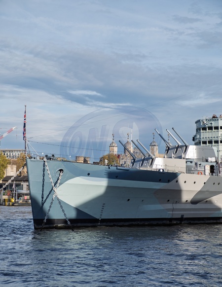 The bow of HMS Belfast with the Tower of London behind.London . United Kingdom. 04 November 2025, Credit:Mark Fairhurst / Avalon