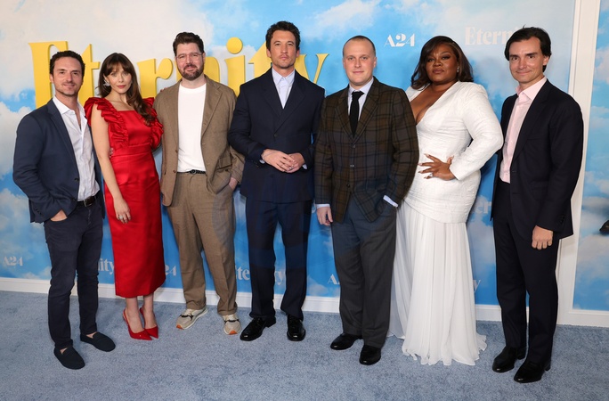 05 November 2025 . Los Angeles, California - Tim White, Elizabeth Olsen, David Freyne, Miles Teller, John Early, Da'Vine Joy Randolph, Trevor White At The Premiere of A24's "Eternity" held at AMC Century City 15 in Los Angeles., Credit:Sadou Faye / Avalon