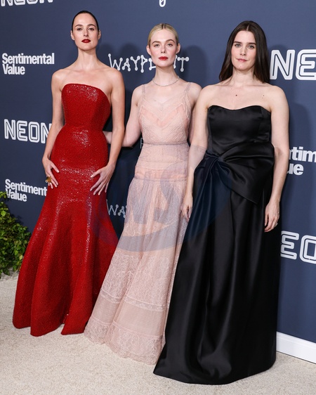 LOS ANGELES, CALIFORNIA, USA - NOVEMBER 05: Norwegian actress Renate Reinsve wearing a Schiaparelli FW25 Couture gown, American actress and singer Elle Fanning wearing a Fendi Couture dress and Cartier jewelry and Norwegian actress Inga Ibsdotter Lilleaas arrive at the Los Angeles Premiere Of Neon's 'Sentimental Value' held at the DGA Theater Complex at The Directors Guild of America on November 5, 2025 in Los Angeles, California, United States., Credit:Xavier Collin / Avalon