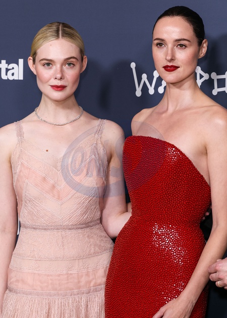 LOS ANGELES, CALIFORNIA, USA - NOVEMBER 05: American actress and singer Elle Fanning wearing a Fendi Couture dress and Cartier jewelry and Norwegian actress Renate Reinsve wearing a Schiaparelli FW25 Couture gown arrive at the Los Angeles Premiere Of Neon's 'Sentimental Value' held at the DGA Theater Complex at The Directors Guild of America on November 5, 2025 in Los Angeles, California, United States., Credit:Xavier Collin / Avalon
