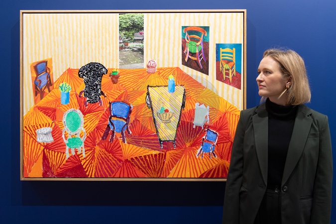 A staff member views 'Reverse Perspective Room. No. 2, June 2025' by David Hockney as part of The 'David Hockney - Some Very, Very, Very New Paintings not yet Shown in Paris Press View' at Annely Juda Fine Art in London, England, UK on Thursday 06 November, 2025., Credit:Justin Ng / Avalon