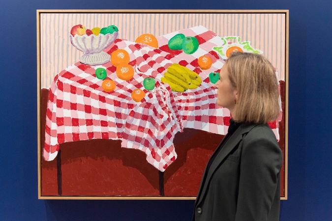 A staff member views 'Still Life With No Curtains, September 2025' by David Hockney as part of The 'David Hockney - Some Very, Very, Very New Paintings not yet Shown in Paris Press View' at Annely Juda Fine Art in London, England, UK on Thursday 06 November, 2025., Credit:Justin Ng / Avalon