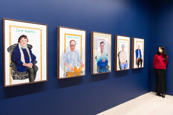 A staff member views (L-R) - 'Jane Kasmin, 12th March 2025', 'Aaron Kasmin, 8th May 2024', 'Joe Simon, 27th January 2025', 'Richard Hockney, 25th March 2025' and 'Marco Livingstone, 6th February 2025' by David Hockney as part of The 'David Hockney - Some Very, Very, Very New Paintings not yet Shown in Paris Press View' at Annely Juda Fine Art in London, England, UK on Thursday 06 November, 2025., Credit:Justin Ng / Avalon