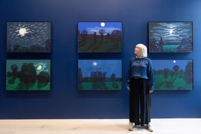 A staff member views (Clockwise L-R) - '8th April 2020, No.2', '7th May 2020, No. 2', '2nd May 2020', '3rd July 2020, No .1', '3rd July, No. 3' and '26th October 2020' by David Hockney as part of The 'David Hockney - Some Very, Very, Very New Paintings not yet Shown in Paris Press View' at Annely Juda Fine Art in London, England, UK on Thursday 06 November, 2025., Credit:Justin Ng / Avalon