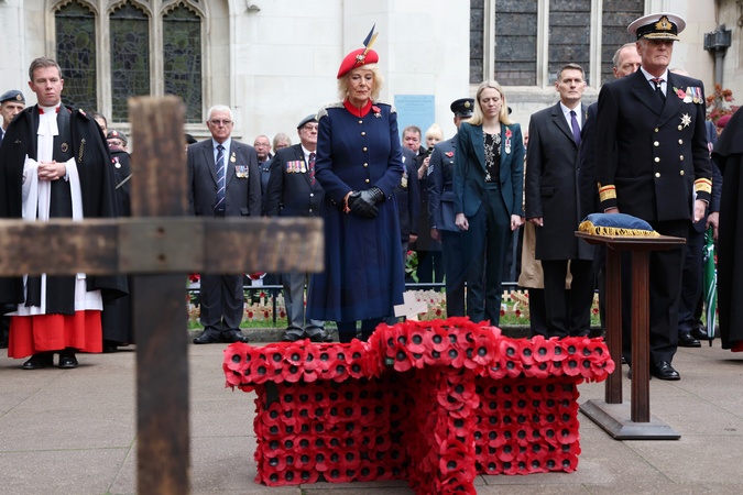 Queen Camilla stands in front of the cross of remembrance during a visit to the 97th Field Of Remembrance at Westminster Abbey on November 06, 2025 in London, England. The Field of Remembrance has been held every November since 1928 when The Poppy Factory, of which Queen Camilla is Patron, brought a group of disabled veterans, a tray of poppies and a collecting tin to the grounds of St Margaret's Church at Westminster Abbey., Credit:Avalon.red / Avalon