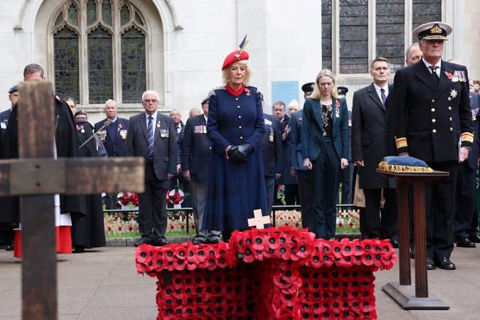 Queen Camilla stands in front of the cross of remembrance during a visit to the 97th Field Of Remembrance at Westminster Abbey on November 06, 2025 in London, England. The Field of Remembrance has been held every November since 1928 when The Poppy Factory, of which Queen Camilla is Patron, brought a group of disabled veterans, a tray of poppies and a collecting tin to the grounds of St Margaret's Church at Westminster Abbey., Credit:Avalon.red / Avalon