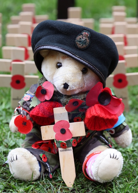 A general view of a Teddy Bear adorned with Poppies on the 97th Field Of Remembrance at Westminster Abbey on November 06, 2025 in London, England. The Field of Remembrance has been held every November since 1928 when The Poppy Factory, of which Queen Camilla is Patron, brought a group of disabled veterans, a tray of poppies and a collecting tin to the grounds of St Margaret's Church at Westminster Abbey., Credit:Avalon.red / Avalon