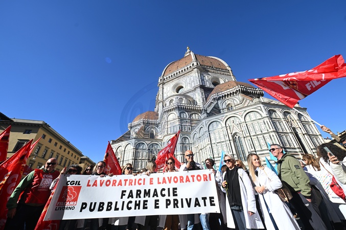 Private pharmacy workers held a strike and protest for the renewal of the national labor contract, which expired in 2024. The strike was called by CGIL, Filcams, CISL, FISASCAT, and UILTCUS. Florence, Italy 06 November 2025, Credit:Aleandro Biagianti / Avalon