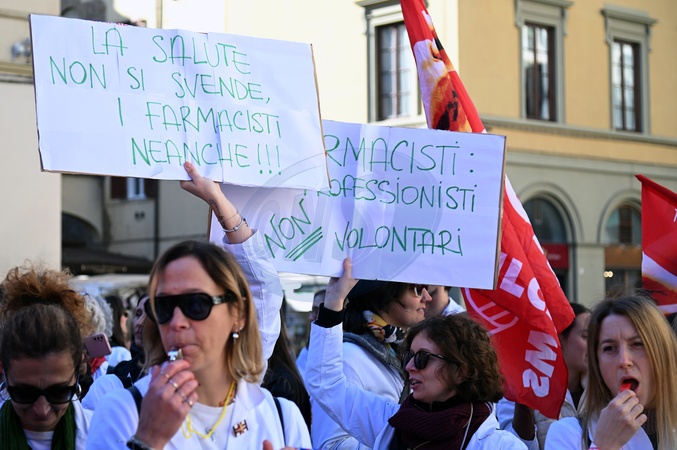 Private pharmacy workers held a strike and protest for the renewal of the national labor contract, which expired in 2024. The strike was called by CGIL, Filcams, CISL, FISASCAT, and UILTCUS. Florence, Italy 06 November 2025, Credit:Aleandro Biagianti / Avalon