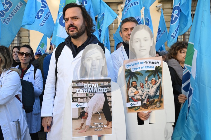 Private pharmacy workers held a strike and protest for the renewal of the national labor contract, which expired in 2024. The strike was called by CGIL, Filcams, CISL, FISASCAT, and UILTCUS. Florence, Italy 06 November 2025, Credit:Aleandro Biagianti / Avalon