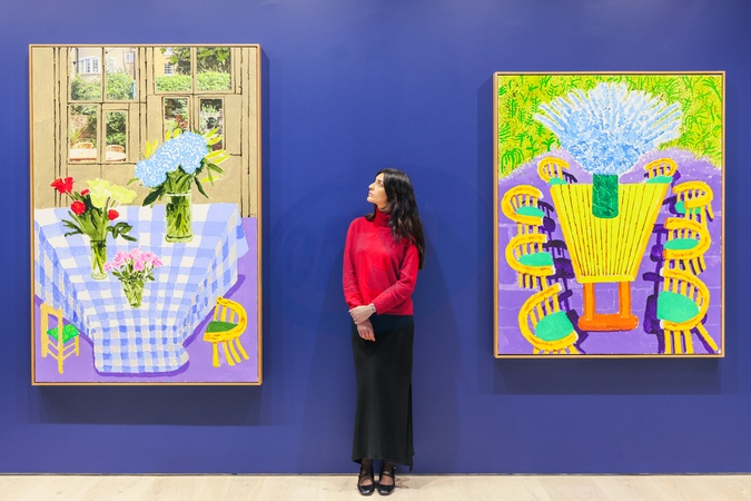 London, UK. 06th Nov, 2025. Staff with left to right, Three Vases on a Table, Inside, August 2025, and Delphiniums on My Garden Table, July 2025. 'Some Very, Very, Very New Paintings not yet Shown in Paris' debuts never-seen-before paintings completed in David Hockney's London studio over the last six months. The show is the inaugural exhibition at Annely Juda Fine Art's new space on Hanover Square., Credit:Imageplotter / Avalon