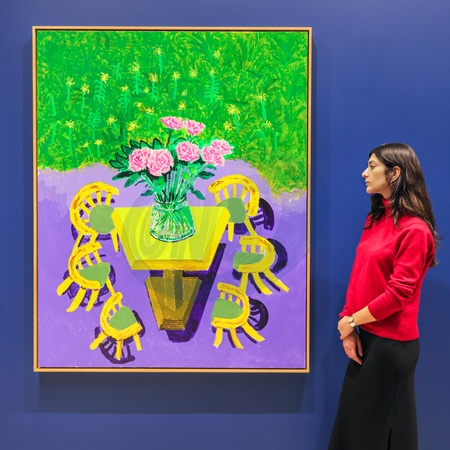 London, UK. 06th Nov, 2025. Staff with Pink Roses on Show, August 2025. 'Some Very, Very, Very New Paintings not yet Shown in Paris' debuts never-seen-before paintings completed in David Hockney's London studio over the last six months. The show is the inaugural exhibition at Annely Juda Fine Art's new space on Hanover Square., Credit:Imageplotter / Avalon