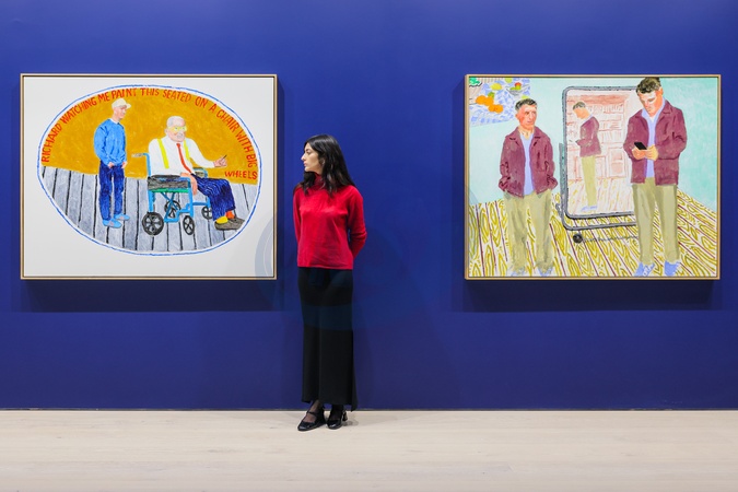 London, UK. 06th Nov, 2025. Staff with left to right, Richard Watching Me Paint This Seated on a Chair with Big Wheels, September 2025 and The Conversation, July 2025. 'Some Very, Very, Very New Paintings not yet Shown in Paris' debuts never-seen-before paintings completed in David Hockney's London studio over the last six months. The show is the inaugural exhibition at Annely Juda Fine Art's new space on Hanover Square., Credit:Imageplotter / Avalon