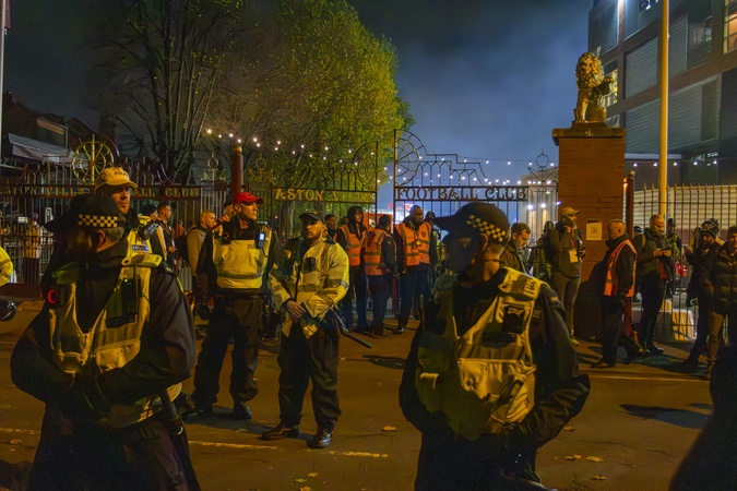 Pro-Palestine protesters gathered outside Villa Park Stadium in Birmingham as Aston Villa hosted Israeli football club Maccabi Tel Aviv. Demonstrators condemned Israel's actions in Gaza and called for sporting boycotts against Israeli teams., Credit:Zak Irfan / Avalon