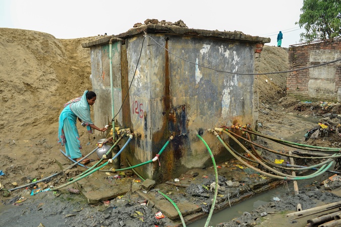 Chattogram, Bangladesh: Women collect water from a deep tube-well in Bakalia area. Most local wells are saline or iron-contaminated, usable only for washing and other cleaning purposes. For drinking, people rely on limited rainwater and private motor pumps, while those who can afford it buy filtered water at 20–40 Tk per 20-liter pot from local dealer., Credit:Md Rafayat Haque Khan / Avalon