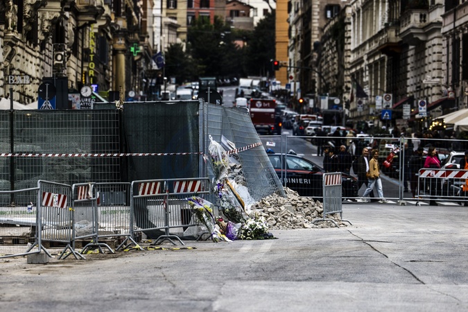 Fiori sotto la Torre dei Conti dopo il crollo