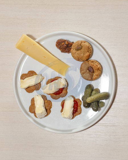 Cheese Plate St Jude Soft Cow's Milk Cheese with Chilli Jam on vegan Haldi Dudh Crackers with turmeric and candied fennel seeds from the Biskut Bar and Neal's Yard Dairy Lancashire Poacher with Cumin & Pistachio Jeera Biskuts from the Biskut Bar, Brinaj Aubergine Pickle and Hawkshead Pickles at Nekter Deli in Shoreditch, London, Credit:Mario Mitsis / Avalon