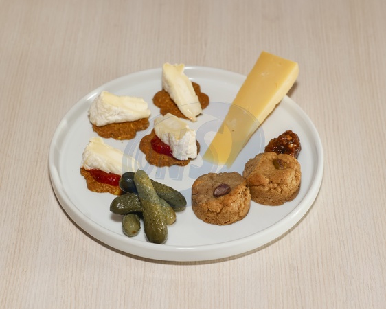 Cheese Plate St Jude Soft Cow's Milk Cheese with Chilli Jam on vegan Haldi Dudh Crackers with turmeric and candied fennel seeds from the Biskut Bar and Neal's Yard Dairy Lancashire Poacher with Cumin & Pistachio Jeera Biskuts from the Biskut Bar, Brinaj Aubergine Pickle and Hawkshead Pickles at Nekter Deli in Shoreditch, London, Credit:Mario Mitsis / Avalon