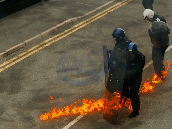 London's Metropolitan Police training in the face of extreme civil disorder, featuring the use of petrol bombs/molotov cocktails. This training took place in conjunction with the NUJ and their visit to the Metropolitan Police Specialist Training Centre in Gravesend, Kent, UK, 7 November 2025, Credit:Alex Day / Avalon