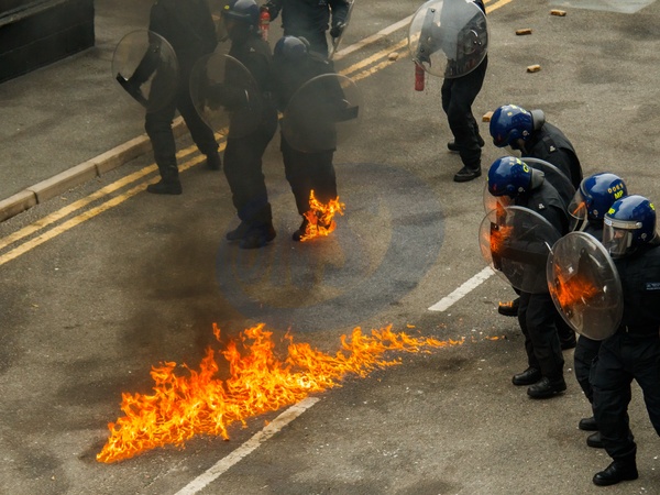 London's Metropolitan Police training in the face of extreme civil disorder, featuring the use of petrol bombs/molotov cocktails. This training took place in conjunction with the NUJ and their visit to the Metropolitan Police Specialist Training Centre in Gravesend, Kent, UK, 7 November 2025, Credit:Alex Day / Avalon