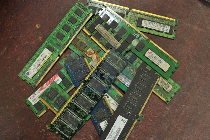 Chattogram, Bangladesh: Computer waste products stored in a warehouse in Chittagong, Bangladesh. Discarded electronic components such as memory chips and circuit boards are part of the growing global e-waste stream. Market demanding countries like Pakistan, China, Hong Kong, and Dubai, similar materials are collected and recycled to recover valuable metals and reusable parts. Asia faces a high demand for e-waste recycling due to its role as both a major producer and consumer of electronics, resulting in large volumes of waste., Credit:Md Rafayat Haque Khan / Avalon