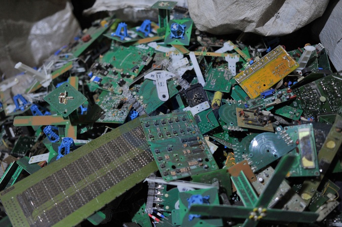 Chattogram, Bangladesh: Computer waste products stored in a warehouse in Chittagong, Bangladesh. Discarded electronic components such as memory chips and circuit boards are part of the growing global e-waste stream. Market demanding countries like Pakistan, China, Hong Kong, and Dubai, similar materials are collected and recycled to recover valuable metals and reusable parts. Asia faces a high demand for e-waste recycling due to its role as both a major producer and consumer of electronics, resulting in large volumes of waste., Credit:Md Rafayat Haque Khan / Avalon