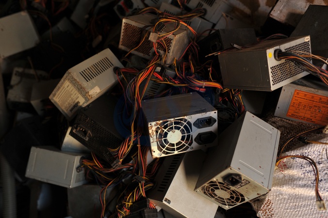 Chattogram, Bangladesh: Computer waste products stored in a warehouse in Chittagong, Bangladesh. Discarded electronic components such as memory chips and circuit boards are part of the growing global e-waste stream. Market demanding countries like Pakistan, China, Hong Kong, and Dubai, similar materials are collected and recycled to recover valuable metals and reusable parts. Asia faces a high demand for e-waste recycling due to its role as both a major producer and consumer of electronics, resulting in large volumes of waste., Credit:Md Rafayat Haque Khan / Avalon