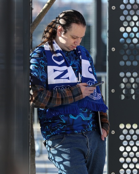 Everton fan checks lineup on his phone ahead of the Premier League match Everton vs Fulham at Hill Dickinson Stadium, Liverpool, United Kingdom, 8th November 2025, Credit:Jorge Horsted/News Images / Avalon