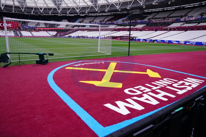 View of West Ham's club badge behind goal net ahead of the Premier League match West Ham United vs Burnley at London Stadium, London, United Kingdom, 8th November 2025, Credit:Harvey Murphy/News Images / Avalon