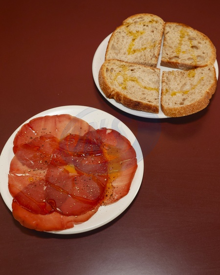 Finely sliced Bresaola (cured beef) with organic EVOO and toasted sourdough bread at Emilia's Crafted Pasta in Victoria, London, Credit:Mario Mitsis / Avalon