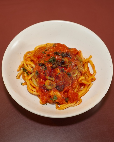 Yellowfin Tuna Puttanesca Bucatini with sustainably sourced tuna, tomatoes, olives and capers at Emilia's Crafted Pasta in Victoria, London, Credit:Mario Mitsis / Avalon