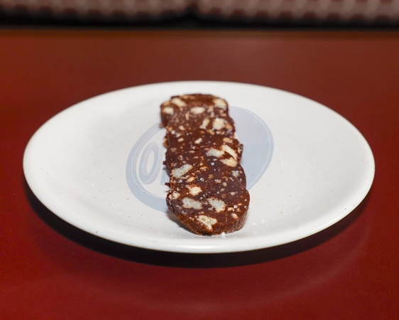 Chocolate Salami made from 54% chocolate and crunchy biscuits with sea salt at Emilia's Crafted Pasta in Victoria, London, Credit:Mario Mitsis / Avalon