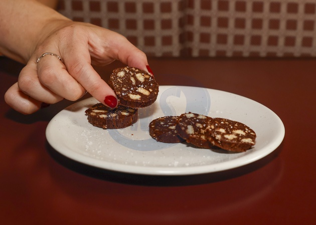 Chocolate Salami made from 54% chocolate and crunchy biscuits with sea salt at Emilia's Crafted Pasta in Victoria, London, Credit:Mario Mitsis / Avalon